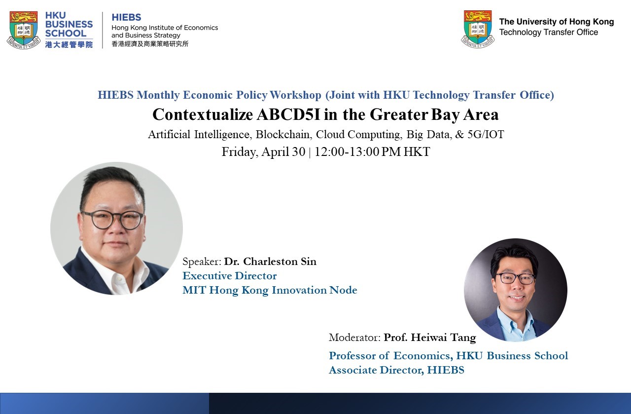 Rundown: Dr. Charleston Sin (bio), Executive Director of the MIT Hong Kong Innovation Node, will first share his views on the topic of “Contextualize ABCD5I in the Greater Bay Area”, followed by an open discussion among participants moderated by Professor Heiwai Tang, Associate Director of HIEBS.