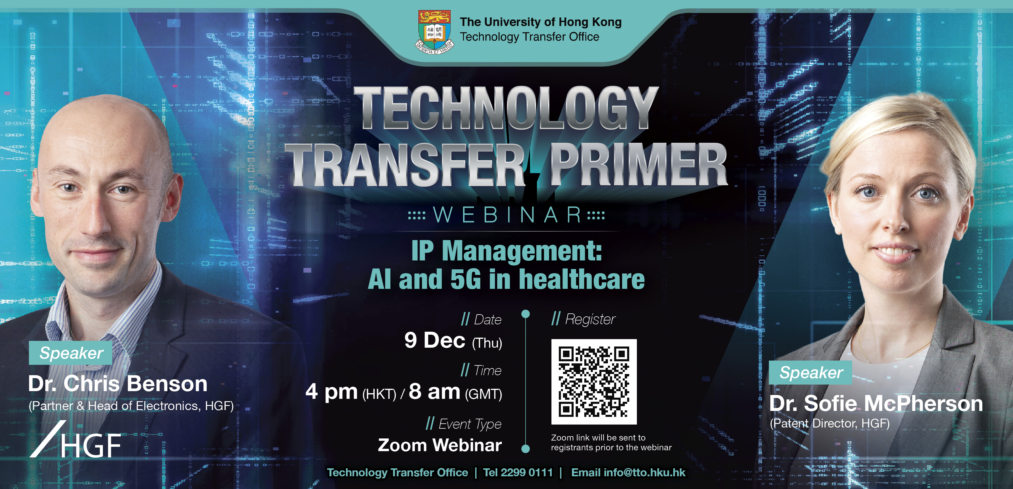 Technology Transfer Primer: IP Management: AI and 5G in healthcare | 9 Dec 2021 (THU), 4pm HK Time/8am UK time (Via Zoom)