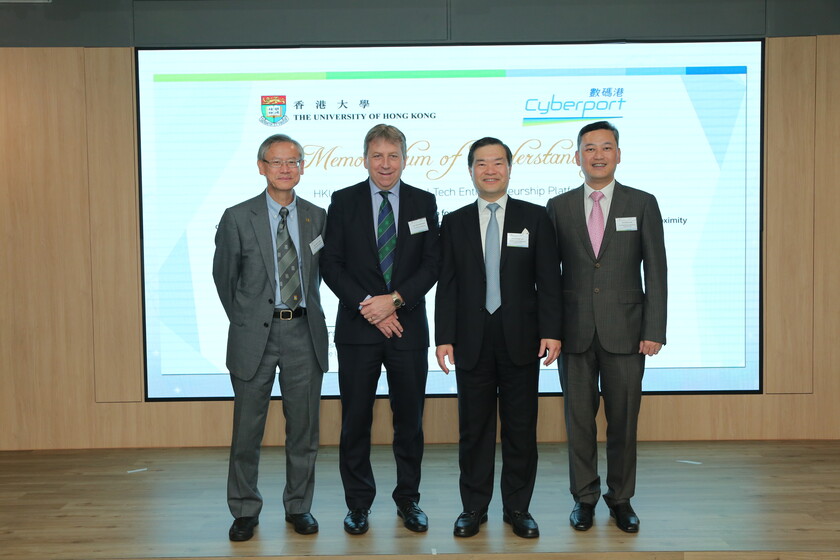 Mr. Herman Lam Heung-yeung, CEO of Cyberport and Professor Andy Hor Tzi-sum, Vice-President and Pro-Vice-Chancellor (Research) of HKU, signed the MoU at Cyberport, witnessed by Dr Lee George Lam, Chairman of Cyberport and Professor Peter Mathieson, President and Vice-Chancellor of HKU.