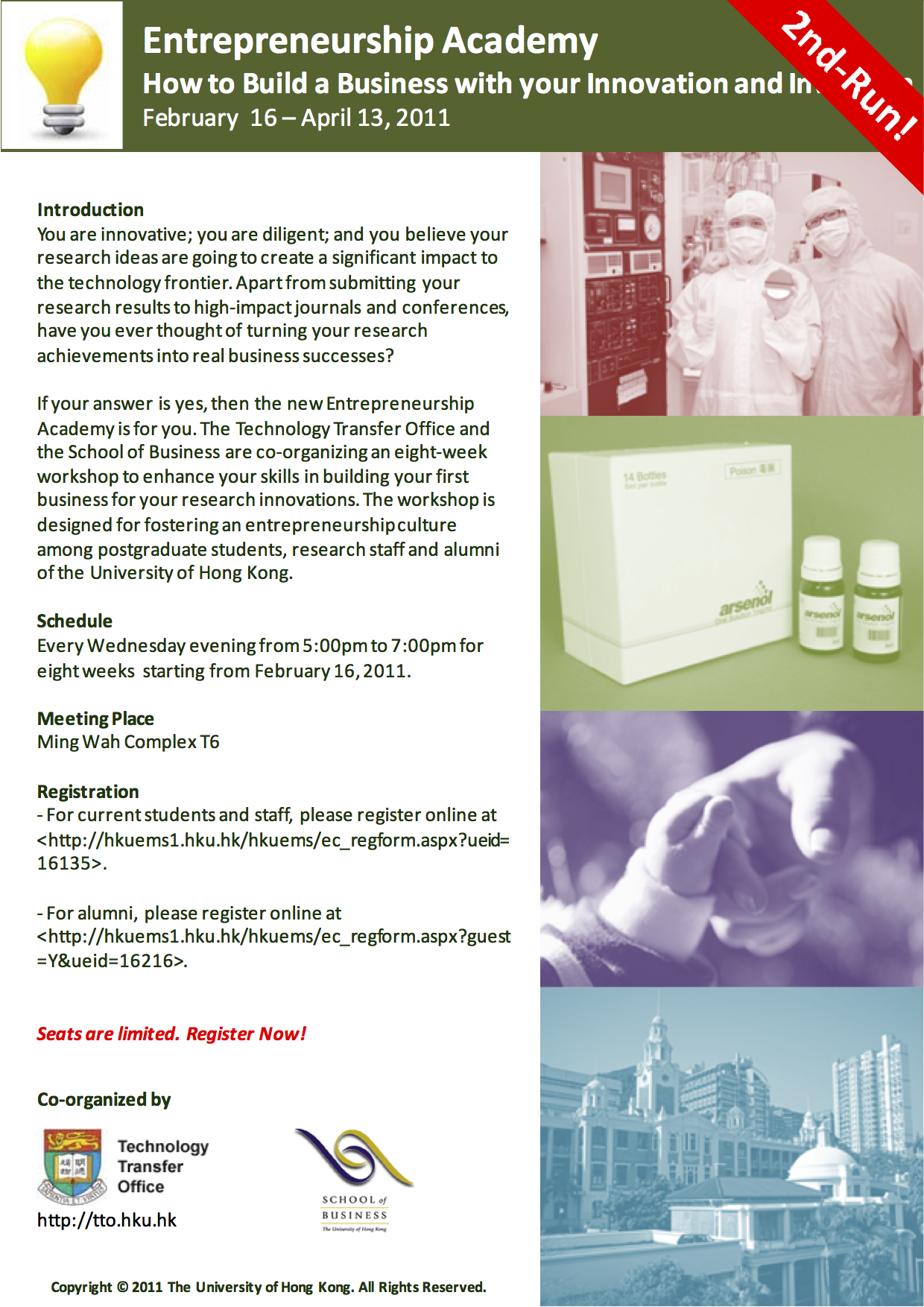 Due to overwhelming interest when we first hosted the Entrepreneurship Academy in the last semester, we offered this Workshop once again in the second semester from February 16-April 13, 2011. The objective was to foster an entrepreneurial mindset as well as sharpen such pertinent skills among our researchers and postgraduate students in the University. Experienced angels, venture capitalist and entrepreneurs were invited as guest speakers in addition to faculty members from the School of Business. Participants were very keen and appreciative of this series.
