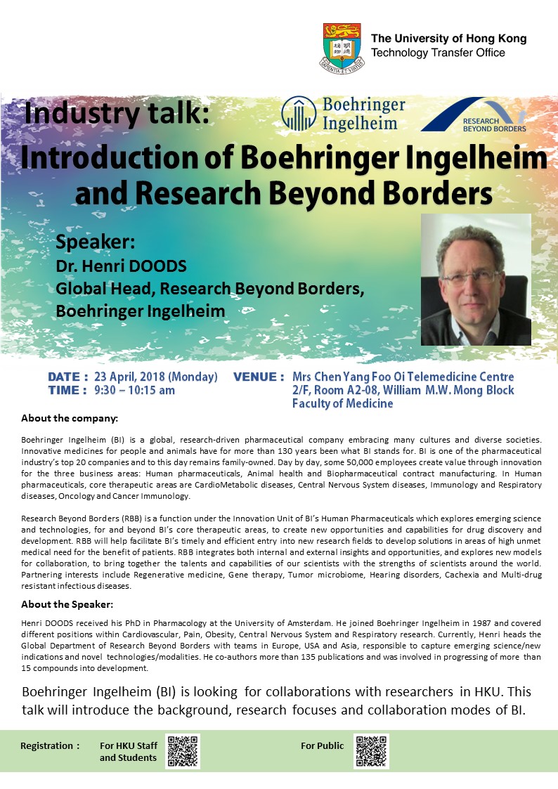 Boehringer Ingelheim (BI) is looking for collaborations with researchers in HKU. This talk will introduce the background, research focuses and collaboration modes of BI.