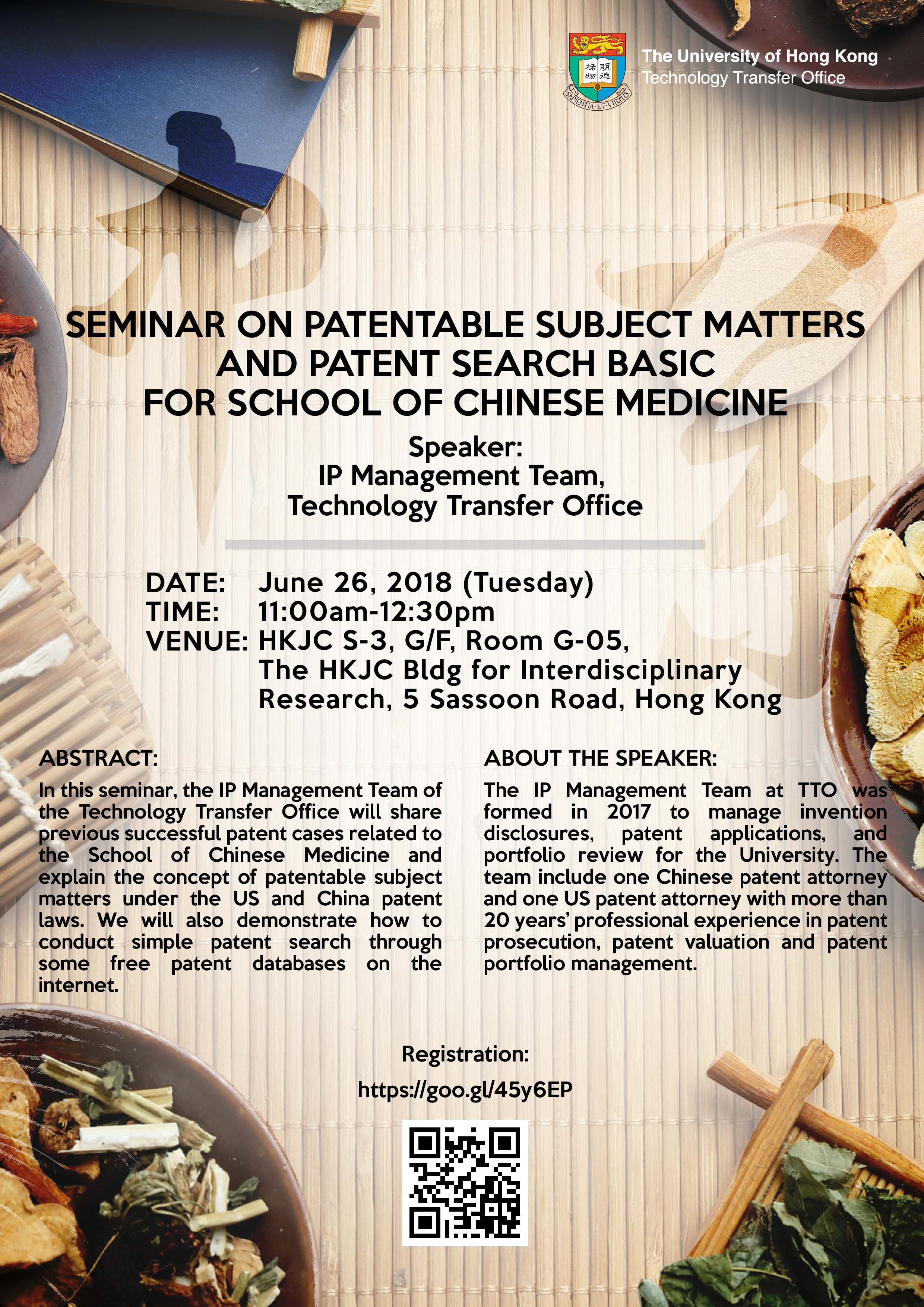 In this seminar, the IP Management Team of the Technology Transfer Office will share previous successful patent cases related to the School of Chinese Medicine and explain the concept of patentable subject matters under the US and China patent laws. We will also demonstrate how to conduct simple patent search through some free patent databases on the internet.