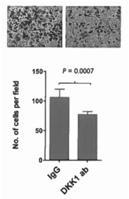 - In vitro test on HCC cell lines showed that anti-DKK1 antibody is able to suppress cell migration of HCC cells.