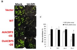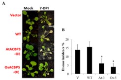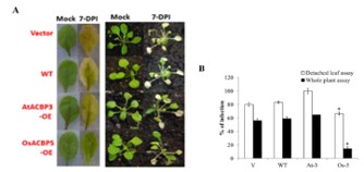 - The present invention describes vectors/expression cassettes for conferring tolerance to fungal necrotrophs along with methods of using OsACBP5 to enhance tolerance to fungal necrotrophs and for screening for genes with OsACBP5-like activity.