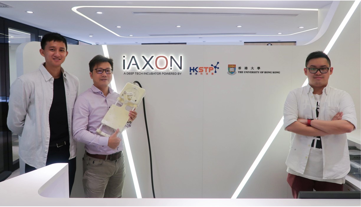 Dr. Ka Wai Kwok (Middle), Associate Professor in the Department of Mechanical Engineering, HKU, with team members, Justin Ho (left) and Alan Tang (right) at the HKSTP-HKU iAXON incubation center.