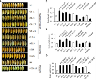 - It’s overexpression enhances the grain size both in length and width by ~10%.