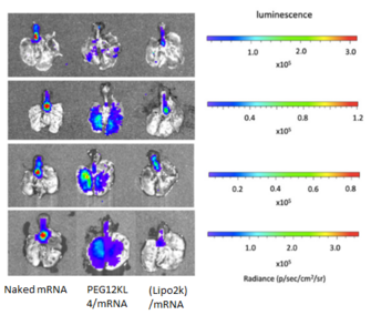 - BALB/c mice (∼20 g) were administered intratracheally with naked mRNA; PEG12KL4/mRNA complexes at 10:1 ratio (w/w); and Lipofectamine 2000 (Lipo2k)/mRNA complexes at 2:1 ratio (w/w). Each mouse received 10μg of mRNA.